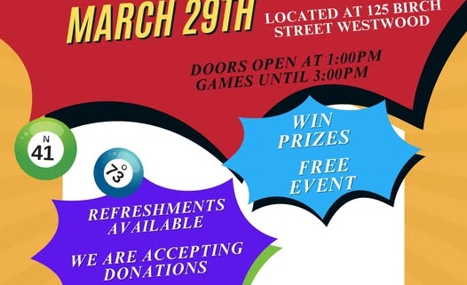 Westwood Family Resource Center is having their BINGO Night March 29th. Located at 125 Birch Street, Westwood.